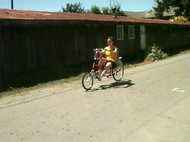 Saturday, June 27, 1998 Kathy tests her new Tour Easy recumbent bike after a preliminary fitting. | |