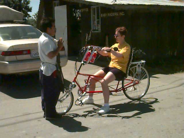 Saturday, June 27, 1998 Kathy gets final instructions in the fitting and maintaining her new recumbent from Manuel, the Easy Racers mechanic. |