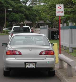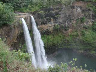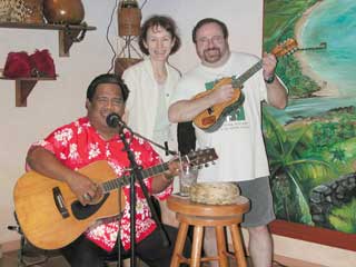 We began by visiting a local fair which was supposed to feature a lot of local artists. In actuality, it was really a bunch of craftspeople. Their craft was ok, for the most part, but it was mostly just the sort of thing you'd expect in the little kiosks you see in shopping malls. Things like stones and cultured pearls strung on strings, carved coconut shells, and simple garments. Then we stopped down the road and picked up a couple of things like sunburn ointment in anticipation of hikes and walks we hope to do later in the week. From there we headed south, just following our whims. We first turned up a Kuamo'o Road to view Opaeka'a Falls (not shown). We viewed the falls from a pull off above the top of the falls. It was impressive, but would have been more impressive if we could have gotten closer to it than the mile or so we were from it. There we met a couple from Detroit and the husband's Turkish sister. They were feeding the zebra striped doves. After talking a while, we headed up to see where the road ended, then came back to the highway and continued south. At Ma'alo Road we saw a sign indicating that Wailua Falls (top left) was located four miles up the road, so we headed up there. This is the falls that showed up on TV's Fantasy Island. We met the Detroit trio again. Back on the highway and heading south again, we drove until it was clear we were running out of places to have lunch, so we turned off at the next road and headed towards Koloa along Maluhia Road, passing though the tree tunnel. The tunnel was more along the line of what I expected for vegetation on Kauai'i. There are over 500 eucalyptus trees lining the road (smaller versions of the trees we have in the bay area). Before two earlier hurricanes, the tree tops totally intermeshed, though I was impressed with what remains. The trees also now are overgrown with various vines and hibiscus plants as well. It would be a great biking road. Unfortunately, few of the roads here even have shoulders wide enough for bicycles. Rather than heading to Po'ipu, we headed west along the ocean front on Lawa'i Road to Spouting Horn. This is a lava shelf that extends a few tens of yards into the ocean and has a few tunnels in it oriented such that waves pulse through them and explode out the top like whale blow holes. There used to be a much bigger blow hole, but in the early 20s a sugar cane owner had one of his workers drop explosives down it because the 200 foot tall spray was stunting the growth of sugar can in about 10 acres of his thousands of acres. We spent some time watching all the chickens with their hatchlings, crossing from one side of the road to the other and back again. Still we don't know why. We decided to head back at this point, stopping in Koloa at a family Italian restaurant for lunch. When we got back to the condo, we took a hike north along the ocean front, which is just a few yards from our front door. We eventually meandered over to the Coconut Marketplace and had dinner at the Hula Girls restaurant. We didn't realize that there was going to be live entertainment until Henry (middle left) showed up and began setting out his guitars and ukuleles. Henry was a good performer to the 4 or so tables that were eating at that time. He got us all involved. We sang along with him, he taught us some Hawaiian lyrics, told some bad jokes, had us sing to our spouses, and engage in other silliness. He even let me hold his custom made, $7,000, abalone inlaid ukulele. A very nice instrument. After dinner, we went to the movie theater in the Market and saw "Rat Race". It was quite a hoot. Certainly one woman there really enjoyed the film -- we heard her roar with laughter though most of the film. Also, whenever Rowan Atkins (of Mr. Bean fame) showed on screen, Kathy began giggling even before he did anything. Overall, the island so far seems much like the California Bay Area, with more impressive mountains and a whole lot more water. The people are the most friendly and helpful I've ever met, though some things never change (bottom left). |