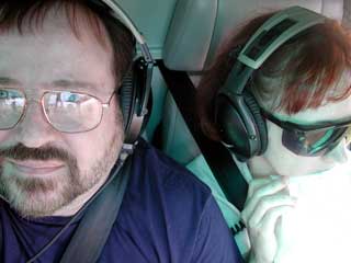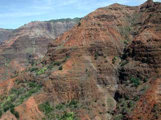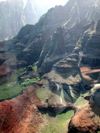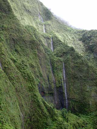 ALERT! ALERT! This is an alert for everyone planning on attending the October 20 picnic. Michael has purchased a UKULELE! And he has a book of Hawaiian songs for it. You have been warned. Cute, Kathy. Well, let me counter by referring to the picture at the left. Kathy is demonstrating the proper use of the "Aloha Bag" provided by Air Kauai'i. To be fair, Kathy is extremely sensitive to motion, having had an inner ear problem all her life. And there were a couple of points in the trip where we all went "weeeee" -- like when you get the moment of weightlessness as you fly over a hill in a car, or the crest on a roller coaster. But actually, the ride was unexpectedly pleasant for the rest of us. What our pilot described as strong turbulence for a helicopter was barely noticeable by me. We showed up a 9:15 am and had to wait a few minutes while the party before us was trucked off for their ride. Then Lani got the six of us together and demonstrated how to strap around our waist the little pack containing our personal life preserver. Since we were going to be flying over water, the FAA required that we all have a life preserver available. "Can we keep this when the trip is over?", Dave asked? "Only if you use it," said Lani. "Don't inflate the life preserver inside the helicopter -- wait until you exit," she added, "that way you won't puncture the life preserver or find that you can't fit through the door because of the inflated vest." We chose Air Kauai'i because more than one of the travel guides said that these guys were the tops. They had helicopters that had more glass area than all but those that flew without any doors at all (which didn't sound all that prudent to us). They had Bose noise canceling headphones for everyone so we could hear each other and Chuck, the pilot (and owner). They provided the best show. And, as Chuck was quoted telling his other pilots, "Don't speak unless it will improve the silence." This was not a tour to show off the pilot's knowledge, this was a tour to give you a deep enjoyment of the land that is Kauai'i. And, Kathy wanted to try something we never would have normally done. "You should confront your fears now and then," she said. She knew that the trip was likely to trigger her motion sickness. Not knowing how I would react, being afraid of heights myself, I joined her in a Dramamine pre travel snack. But Chuck couldn't have been a more considerate pilot. Once we put on the headphones, Chuck started the rotor. Other tours had the rotors going when you boarded. Chuck didn't want his guests to have to duck under rotors and have to listen to the deafening roar of the blades. It was amazing just how effective the headphones were in canceling the noise. A couple of times, I removed one headphone just to remind me how loud the roar was without them. From then on, the ride was like floating on a cloud, for me, for the most part. Kathy was constantly aware of the subsonic pulsing of the copter as the blade rotated. I never noticed. "Can we take flash pictures?", Dave asked. "I'd rather you didn't," said Chuck, "The Japanese lightning will only reflect off the glass surfaces, blinding me and ruining your pictures." We followed another company's tour helicopter for a few seconds, then they headed off in a different direction. Chuck told us how he wanted us to see the different aspects of Kauai'i's landscape, and he was very concerned about the path he took. "We don't fly over resorts or residential areas," he said. He felt that helicopters had the least impact on the environment, and he included the impact on the residents in that statement. We were going to see land on which no person had ever laid a foot. And I'm sure he was right. Shortly into the tour, we flew up the Waimea Canyon (second picture). This is Kaui'i's equivalent of the Grand Canyon. I haven't seen Arizona's Grand Canyon, but this was freakin' awesome. The book, "The Ultimate Kaua'i Guidebook", 3rd edition, says, "Going to Kaua'i without taking a helicopter flight is like going to the Sistine Chapel and not looking up." I can't tell you how many people recommended this book or were carrying this book. It is indeed the best of the books we have. Chuck gave Kathy several tips for dealing with her motion sickness. In particular, he said what many others have said -- focus on some fixed point on the distant horizon. And that pretty much worked until about 10 minutes into the flight when we descended from four thousand feet at the canyon tops to near the bottom of the canyon, and the horizon disappeared. But what a site. I've included three pictures here from different points along the trip, but I can say that NO picture can do justice for what you will see. The third picture is along the Na Pali coast. Try to image the riot of color that is really there. The picture I'm showing suffers from both the limits of color reproduction, and the fact that it is dulled by the reflection of the glass surfaces of the helicopter. Look at the dim features in the distance. These are unbelievably thin, nearly vertical surfaces, like spires in a church. You just can't image how awe inspiring they are until you see them in person. The bottom picture is hear the Wai'ale'ale Crater -- one of the wettest places on earth with nearly 500 inches of rain per year. Chuck took us into the hollow of the crater where you are surrounded by water falls on every side, falling 3000 feet to the floor of the crater. Chuck had us nearly nose to nose with several of the falls. I felt like a giant dragonfly hovering. And the lush greenery in this wet climate is like nothing I've seen before. The trees had fans of leafy branches that looked something like giant corkscrews boring up from the volcanic surface. This was certainly the high point of this visit so far. I won't demean it by trying to show you a lot of pictures. I hope the poor pictures I've shown tempt you to come out here and take the tour with Chuck. It's an experience that wil