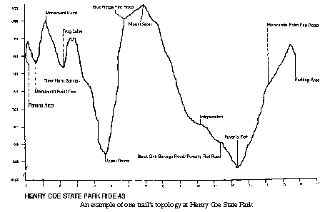 To minimize any misunderstanding, and to avoid later law suits, the better guide books include a topographical side view of the trip, showing how the trail climbs and falls over the distance. So, for instance, the regular trails at Henry Coe pretty much all consist of an 1100 foot drop over the edge of one cliff closely followed by an 1100 scaling up a sibling cliff. The trail to Frog Lake, however, was described as a beginner's trail.