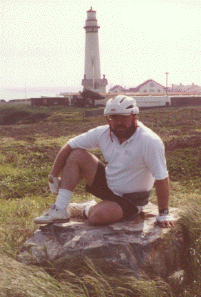 About this point, we turn right off Highway 1 onto a little side road that takes us to the Pigeon Point Lighthouse. Past the lighthouse a few yards are a few large flat boulders which are away from the tall steep cliffs leading down to the ocean. Six foot waves crash over two or three huge rock pillars which stick up 20 or 30 feet above the ocean surface. A stiff northerly breeze is blowing here, as usual. This is the spot where we rest and eat. Unfortunately, I get to eat a "Power Bar."