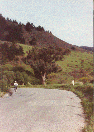 I dimly recall, at this point, drinking some water from one of my two water bottles. Well, perhaps I collapsed and someone poured the water down my throat to revive me. In either case, I must not have fully recovered my normally sharp mental faculties, including my strong sense of survival. I was so happy to be done climbing that hill, that I took off down the other side of the hill like my mother going to a garage sale. Fifteen miles an hour, twenty, twenty-five, thirty, thirty-one and then a car came around a sharp corner heading for me on this narrow, slippery road. Well, I can tell you that I very nearly made the seat on my bicycle a whole lot softer to sit on.