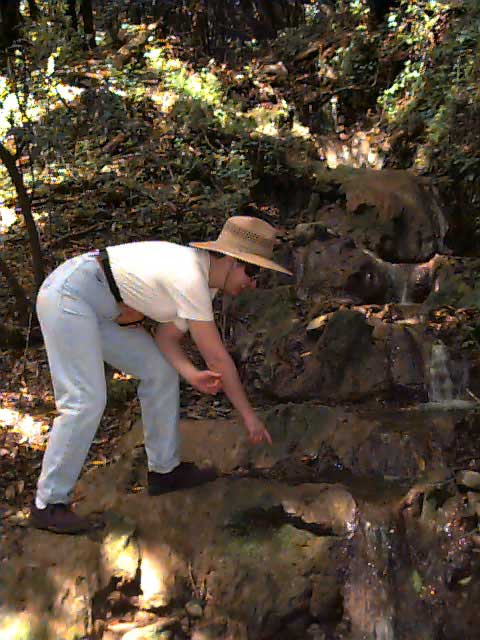| The earthquake did, however, cause a small crack to appear and a new hot spring resulted. Here Kathy is about to test the temperature of the super heated water. |