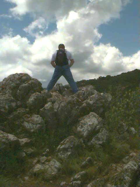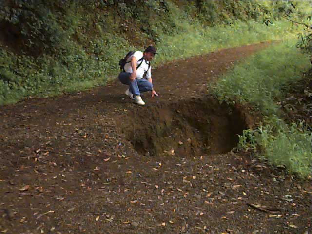 One of the theories about plate faults is that there are anomalies in the gravity around them. One can see large scale displays of this in "The Mystery Spot" in Santa Cruz, and in the inverse weather zone that exists in Menlo Park. In order to test this theory, we make measurements of gravity by measuring the acceleration of objects. The acceleration of gravity on Earth varies slightly around the globe. A ballpark measurement might be about 9.8039 meters per second per second. What we really want to know is if the acceleration changes in the area of a fault. What we do then is to send drops of fluid over a cliff near the fault and measure how long it takes for the fluid to hit the ground, then we work the math backwards. Fluid drops work well because they form small, minimal-friction spheres. Here we see Michael sending drops over a cliff. |