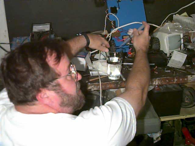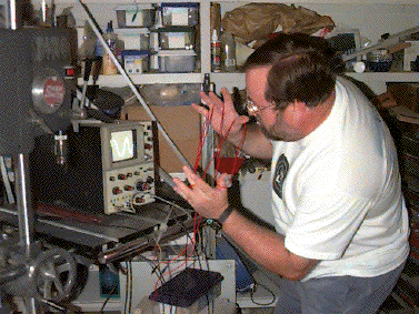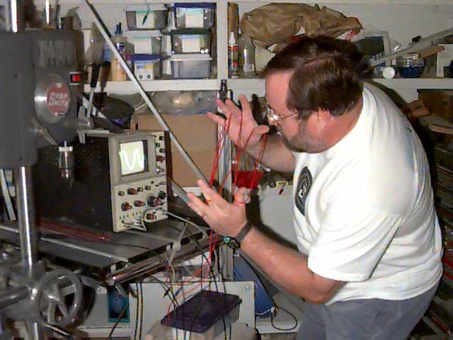 Not all work is done in the field. Because of our limited funds, we often have to craft our own equipment. Here we see Michael in the lab, testing out one of the sensor coils for one of our seismic sensor models. When it has been calibrated, its characteristics will be written into an EPROM chip in one of our tele remote sensor packages, which will then be buried or mounted at one of our field sites. A pendulum will be suspended above the coil, which during an earthquake, will cause changes in the standing waves in the sensor coil. Those changes will be recorded as an energy vector over time and radio-relayed to one of our central computer banks. |