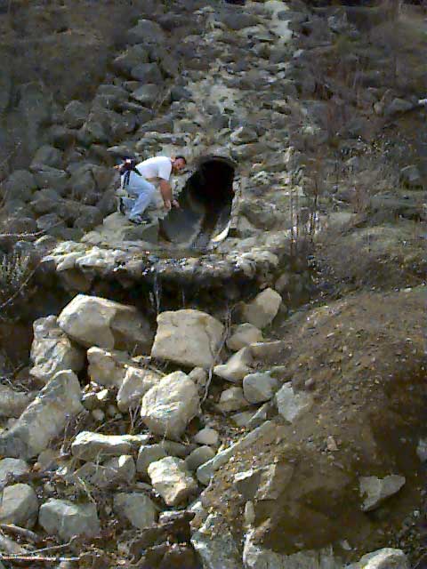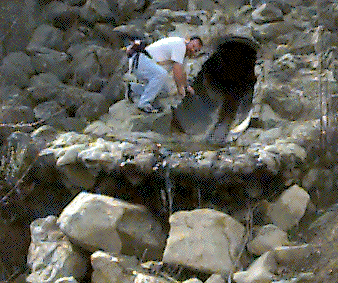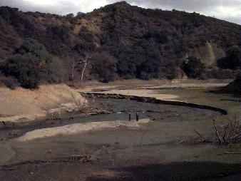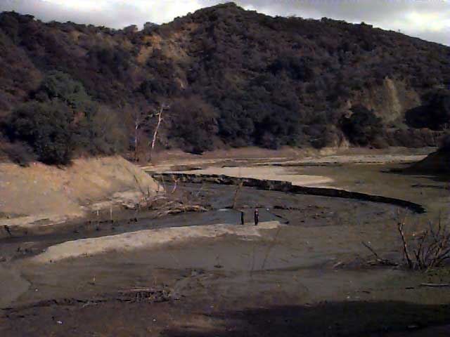 To quote Mark Monmonier in " Ten Risky Places", "Almost any place in California, for various reasons: In addition to earthquakes, wildfire, landslides, the state has volcanically active areas in the north, around Mt. Shasta and other major volcanoes, as well as in the east, where the Long Valley Caldera shows signs of renewed activity. Even beyond its infamous seismic zones, California's shoreline is vulnerable to tsunamis (seismic sea waves) from submarine earthquakes throughout the Pacific. More recent additions to this smorgasbord of hazards are smog, freeway snipers, urban riots, oil spills, and (looking ahead a few decades) severe water shortages. " Yes, the Society must be ever vigilant, ever prepared. Here, two of our scientists inspecting volumes and flow rates in a mud flow plane near the bottom of the Knottmye fault. |