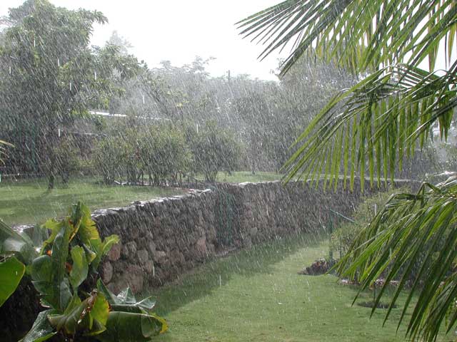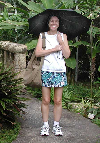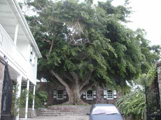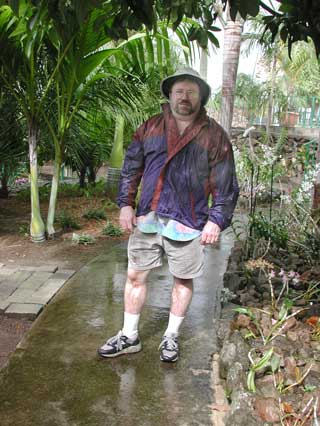 It was a breezy day. You might even say it was a windy day. In fact, sailors would say it was a good blow. The kind of breeze that would have kept the Edmund Fitzgerald in port but not tourists paying good money to be entertained. The Caribe Breeze (photo left with pilot and navigator ready to take on passengers), our ferry for the 40 minute trip to Nevis, bobbed at the dock. Just looking at her set my stomach to churning. She is the top boat in the ferry line, making the crossing in 15 to 20 less than the other ferries. She is also the only one with an air conditioned lounge for the passengers. The less said about my experience on the crossing, the better. Let's just say that riding exposed to the elements on top, I made it to Nevis without losing my breakfast while Mike in his "air conditioned lounge" below was treated to fruit punch and cheesy snacks. Mike said that the air conditioned lounge meant that the recirculated diesel fumes were kept cool. We were met at the docks in Nevis by our guide for the day, TC. She is the reason that we came to St. Kitts and Nevis. After our plans for going to Martinique panned out, we couldn't find any other tropical island we wanted to visit. One afternoon while surfing the satellite, I came across Meshach Taylor's series on the Caribbean. The episode was on Nevis, and he had a wonderful red haired guide, TC, who made the island seem like the perfect place for Mike and me to visit. I went to see our travel agent Cookie the next day and here we are. TC was everything we expected, a colorful and thoroughly entertaining personality. She immediately offered to call Nevis Express, the local island hopper airline, to see if she could get us a flight back to St. Kitts so I wouldn't have to take the ferry again. She then cranked up the air conditioning on her van and started our tour. Our first stop was at the Horatio Nelson museum. Nelson was stationed here while he served with the British Navy. At the time Nevis was the queen of the Caribbean and the wealthiest island there was. Nelson met the young widow of a planter, Fannie Nesbit, and fell in love with her. They eventually married and moved to England. The tree in the photo left is at the Montpelier Plantation. It shows what happens when you let those ficus trees, that grow in offices everywhere, outside for 34 years . The building behind the tree was the original sugar mill but is now an inn. Further down the road is the plantation great house where Nelson and Fannie married. A short distance from the main house is the Botanical Gardens of Nevis, a showcase of tropical plants. A light rain had been falling intermittently as we arrived, but didn't seem to be a problem. We paid our admission to the garden, got a map, and started on our way. Just as we came to the end of the palm tree section at the far end of the gardens, the rain came in earnest. (first photo at top) It came in sheets with gusty winds that threatened to turn my umbrella inside out (photo below left). Mike hadn't brought his umbrella, just his jacket and hat and he got thoroughly soaked (photo below right). |