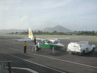 There were also a couple of colorful finch-sized birds that were born over the bar, so they were very bold and not at all adverse to, say, hopping up on the table and stealing sugar from your bowl. Since we had to hurry to catch the plane, TC bypassed most of the sites on our way to the airport. She did point out the haunted estate and talked to us about early slavery in the area. She pointed out the prison for the island. It help as many as 17 people and the most common crime was petty theft - usually people taking things like food from work. You could be imprisoned, though, for a week to a month for swearing. You could see the difference between Nevis and St. Kitts all around you. Nevis is the poorer island as it has no industry besides tourism, yet it is almost immaculately clean, while on St. Kitts there is quite a lot of trash around the villages. The Nivisians apparently are a lot prouder of their villages. There were quite a lot of other stories TC told us, some of which I captured on my video camera. She also had a lot of basic information on hand. I asked about trash pickup and water delivery and disposal. You can get government water, but many or most have cisterns for their water supply. Those houses that don't just have an outhouse have a septic system. Not all houses even have running water. There are fewer shacks on Nevis than on St. Kitts. We arrived at the airport at about 4:00 pm, hoping to catch a ride on the shuttle. The airport itself consists of a single building, about the size of a double-wide mobile home, or perhaps a little bigger. A somewhat bigger concrete building is under construction next door. Several small planes came and left without taking us and we began to get worried that we were going to be left on the island all night with no place to stay. Finally, around 6:00, the little 8-seater plane (photo left) came to shuttle us back. The pilot gave us his safety lecture. "Please buckle your seat belts. That red handle is the emergency exit. I've got a fire extinguisher up front there." Mr. Sergeant, one of our previous tour guides, was waiting for us in St. Kitts to take us back to Ottleys. Tomorrow, we'll probably stay at the Plantation Inn until mid afternoon and then go into Basseterre to see if any celebrations have begun. |